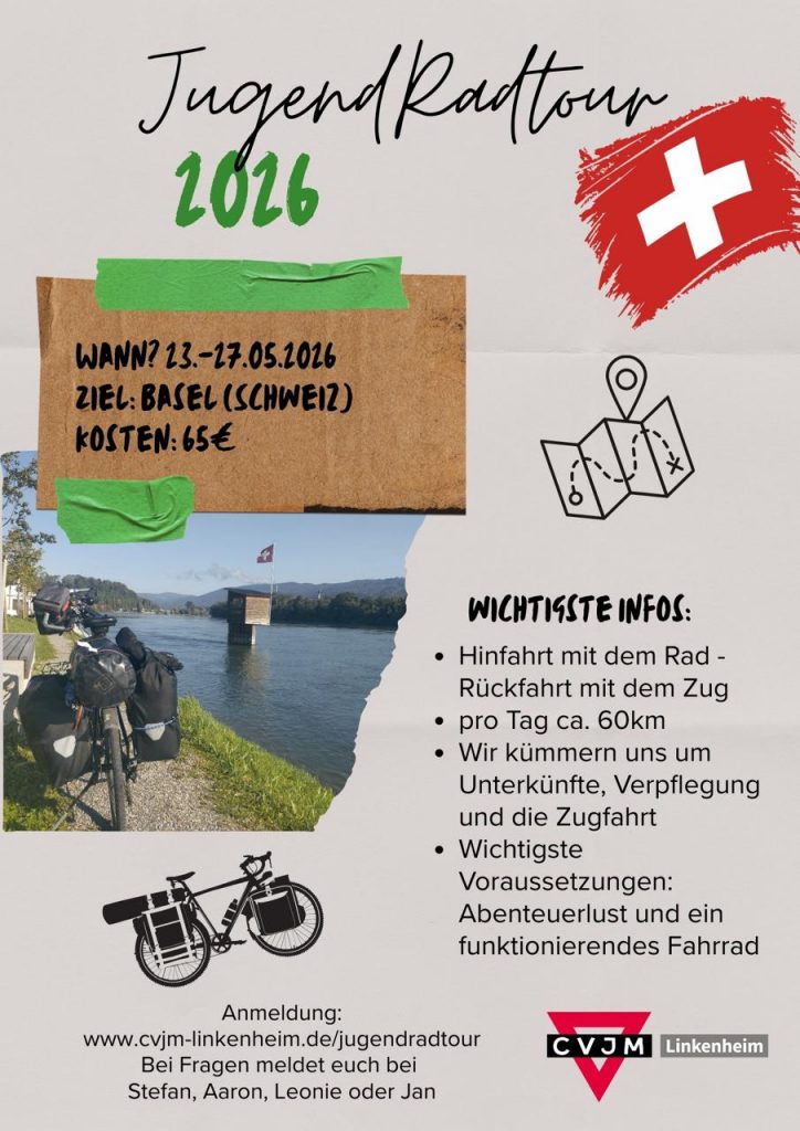 Wir haben die Strecke bis nach Basel in etwa gleich große Tagesetappen eingeteilt. Für die nächtlichen Unterkünfte ist dabei natürlich auch gesorgt. Wir werden in verschiedenen anderen Gemeinden und CVJM jeweils für eine Nacht zu Gast sein, daher braucht ihr eine Luftmatratze und einen Schlafsack.